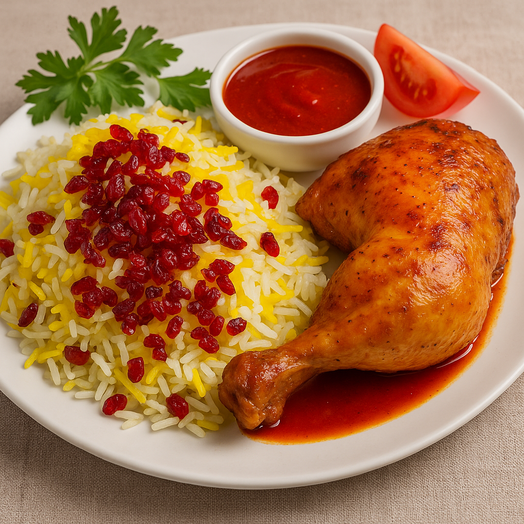 Fragrant persian rice with tangy barberries,served with a golden chicken leg in a rich tomato sauce.